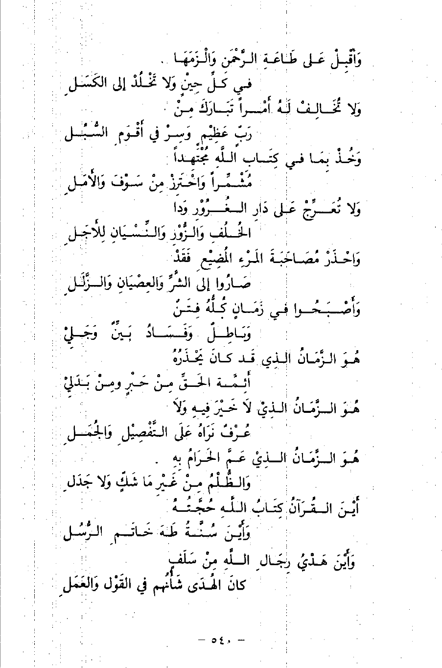 وَأَقْبِلْ عَلى طَاعَةِ الرَّحْمنِ وَالزمْهَا ... في كَلِّ حِيْنٍ وَلا تَخْلُدْ إلى الكَسَلِ