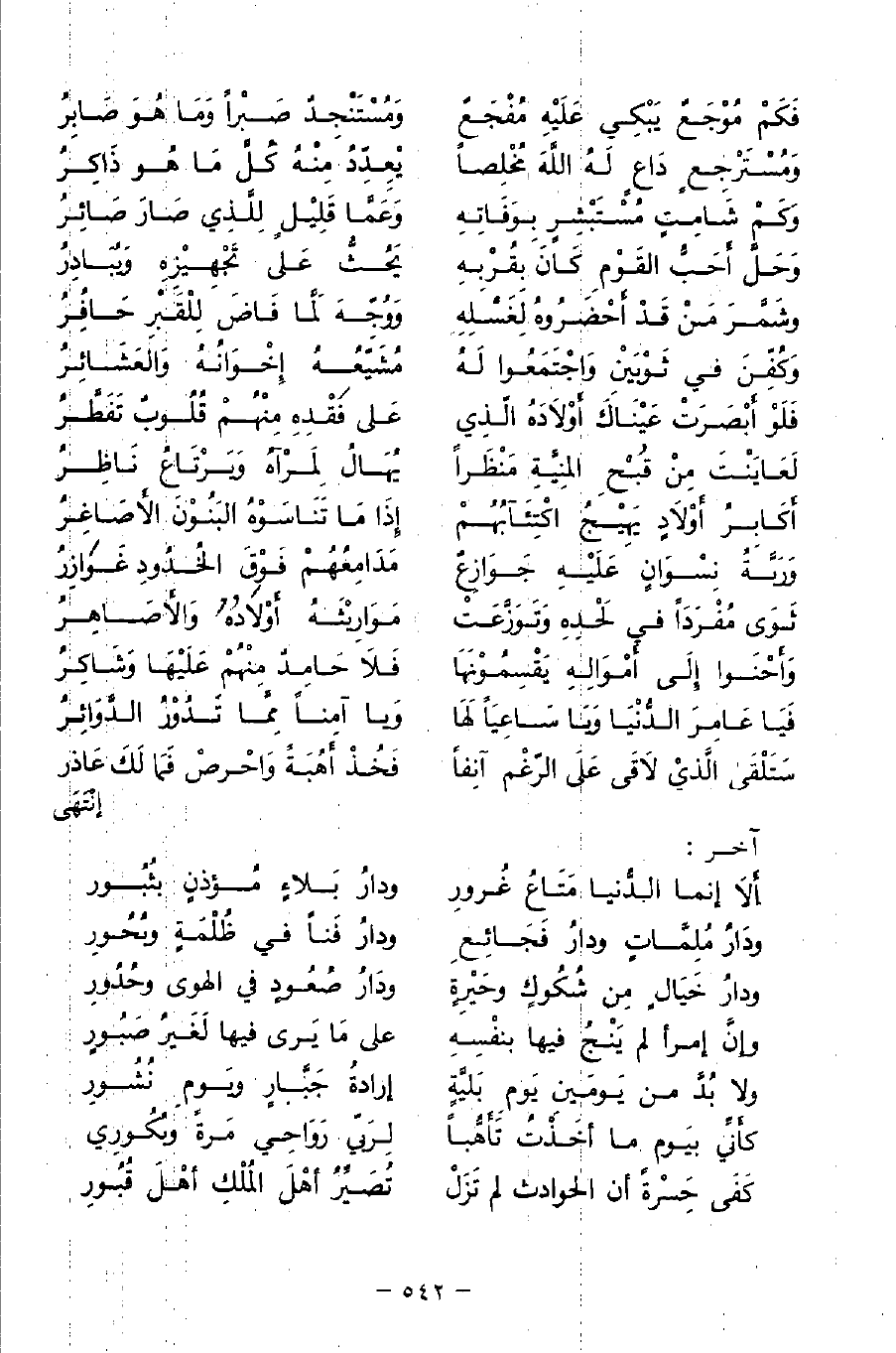 أَلاَ إنما الدُّنيا مَتَاعُ غُرُورِ ... ودارُ بَلاَءٍ مُؤذِنٍ بِثُبُور