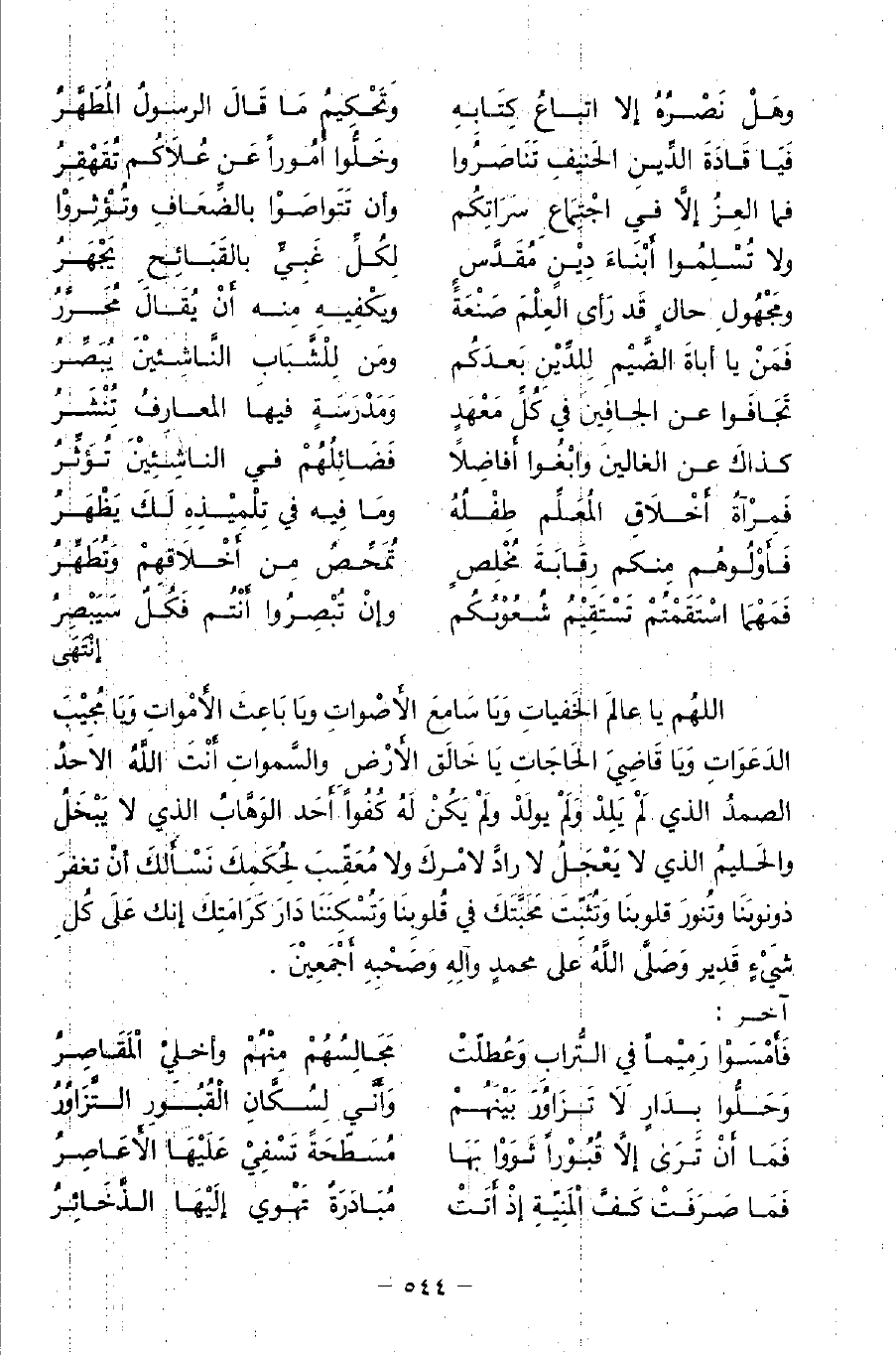 اللهُم يا عالمَ الخَفياتِ وَيَا سَامِعَ الأَصْواتِ ويَا بَاعِثَ الأَمْوَاتِ وَيَا مُجِيَب الدَعَوَاتِ وَيَا قَاضِيَ الحَاجَات يَا خَالَق الأَرْضِ والسَّمواتِ أَنْتَ اللهُ الاحدُ الصمدُ الذي لَمْ يَلِدْ وَلَمْ يولَدْ ولَمْ يَكُنْ لَهُ كُفُوًا أَحَد الوَهَّابُ الذي لا يَبْخَلُ والحَليمُ الذي لا يَعْجَلُ لا رادَّ لأمْركَ ولا مُعَقِّبَ لِحُكَمِكَ، نَسْأَلكَ أنْ تغفرَ ذنوبَنَا وتُنورَ قلوبنَا وَتُثَبِّتَ مَحَبَّتَكَ في قُلوبنَا وَتُسْكِنَنَا دَارَ كَرَامَتِكَ إنك عَلَى كُلِ شَيْءٍ قَدير، وَصَلَّى اللهُ على محمدٍ وآلِهِ وَصَحْبِهِ أَجْمَعِيْنُ.
