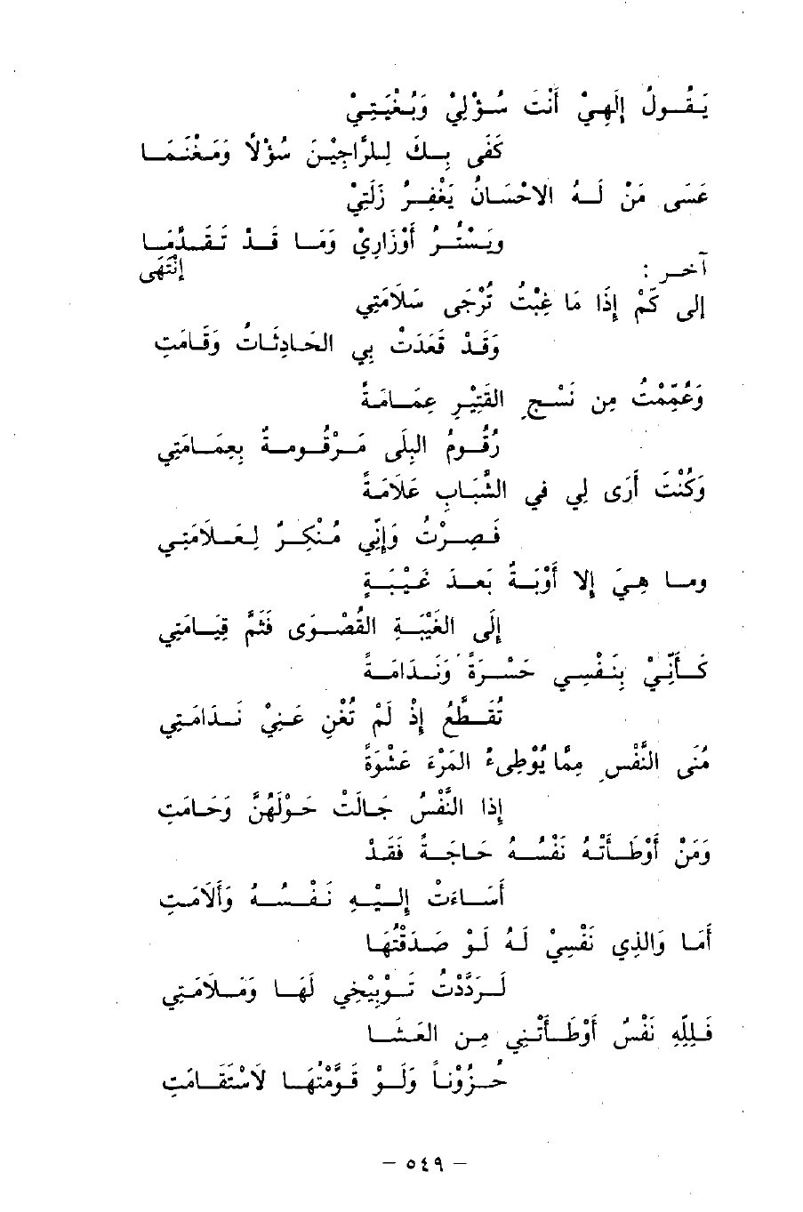 يَقُولُ إِلَهِيْ أَنْتَ سُؤْلِي وَبغْيَتِي ... كَفَى بِكَ لِلرَّاجِيْنَ سُؤْلاً وَمَغْنَمَا
