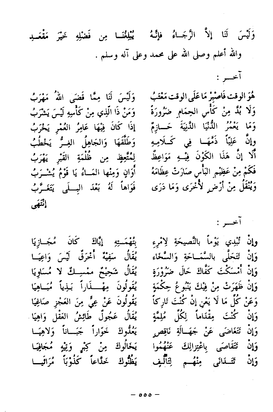 أَلاَ إنَّ هَذَا الكَوْنَ فِيْهِ مَوَاعِظٌ ... لِمُتَّعِظٍ مِن ظُلْمَةِ القَبْرِ يَهْرَبُ