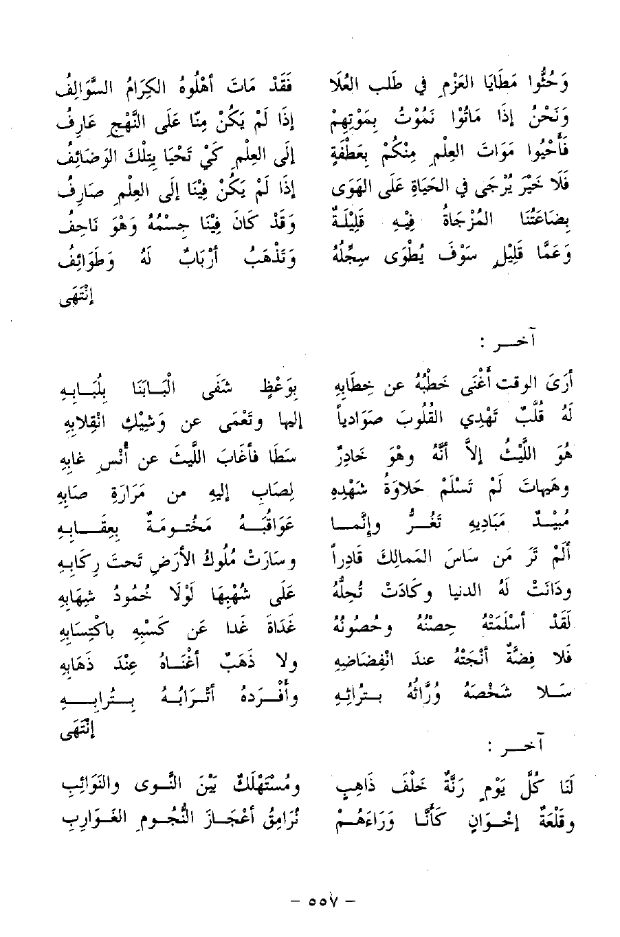 فَأَحْيُوا مَوَاتَ العِلْمِ مِنْكُمْ بِعَطْفَةٍ ... إلَى العِلْمِ كَيْ تَحْيَا بِتِلْكَ الوَصَائِفُ