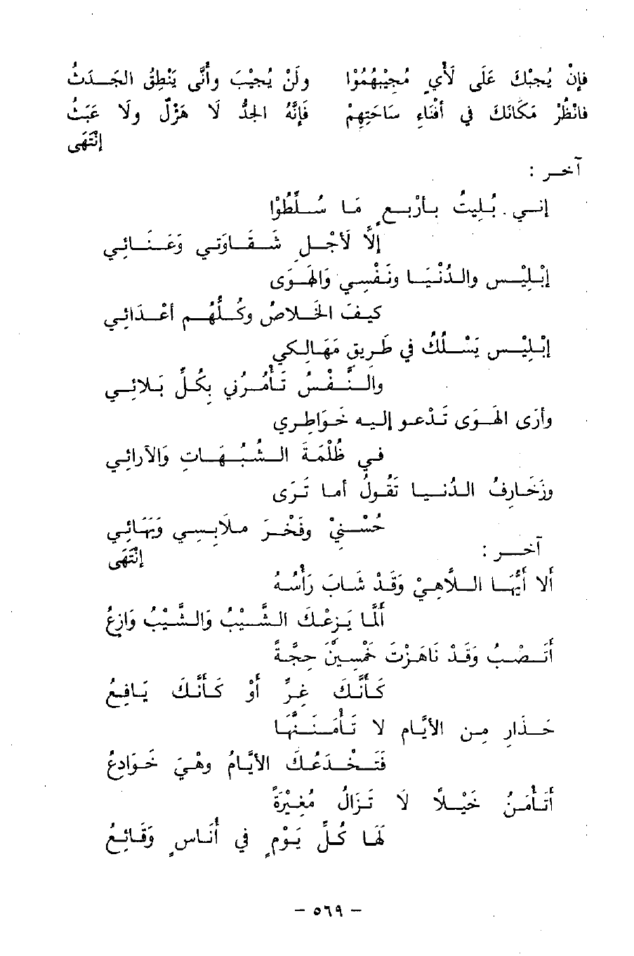 إبْلِيْس يَسْلُكُ في طَرِيق مَهَالِكي ... والنَّفْسُ تَأْمُرُني بِكُلِّ بَلائِي