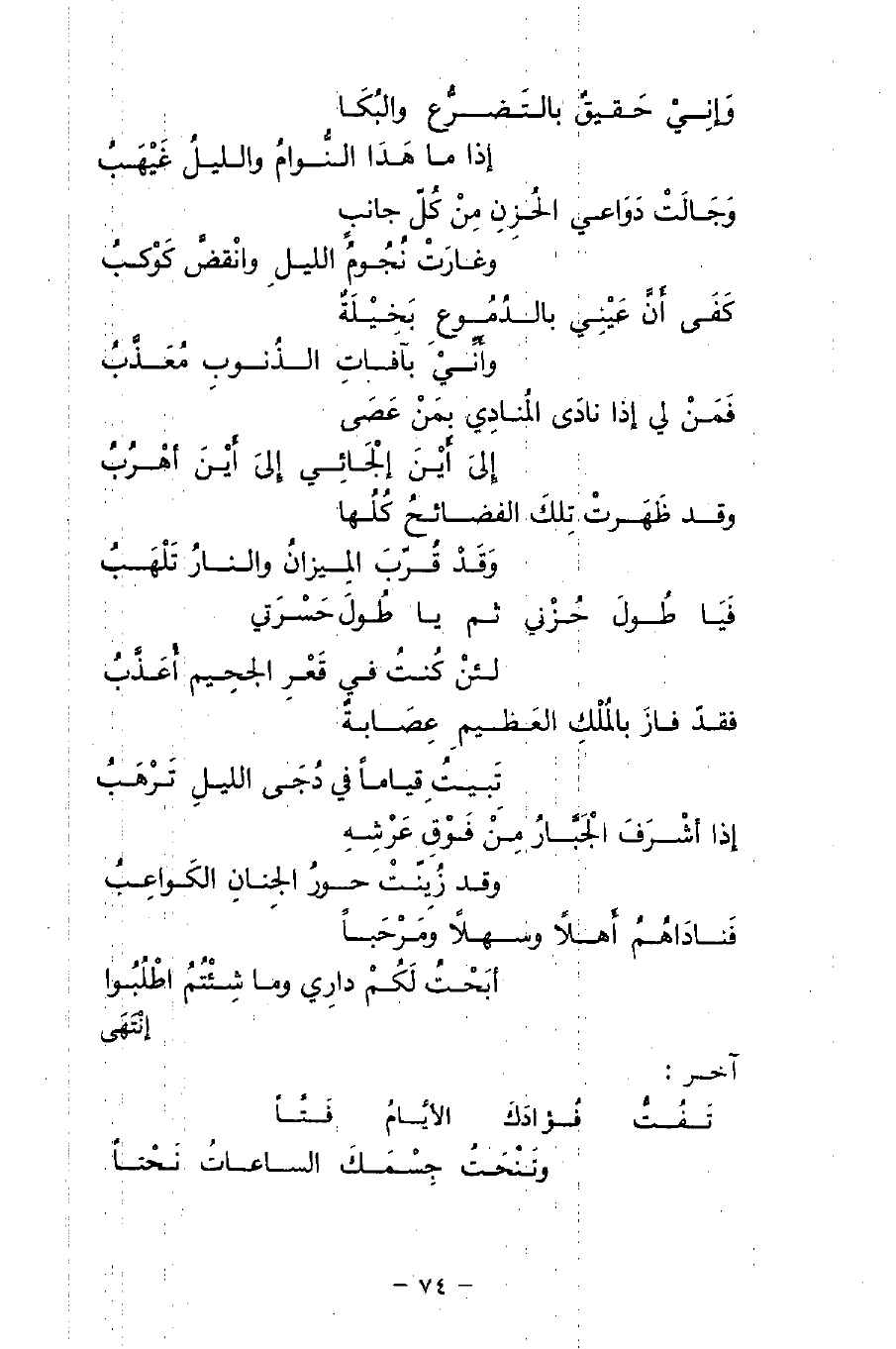فَيَا طُولَ حُزْني ثم يا طُولَ حَسْرَتي ... لئنْ كُنتُ في قَعْرِ الجحِيم أُعَذَّبُ