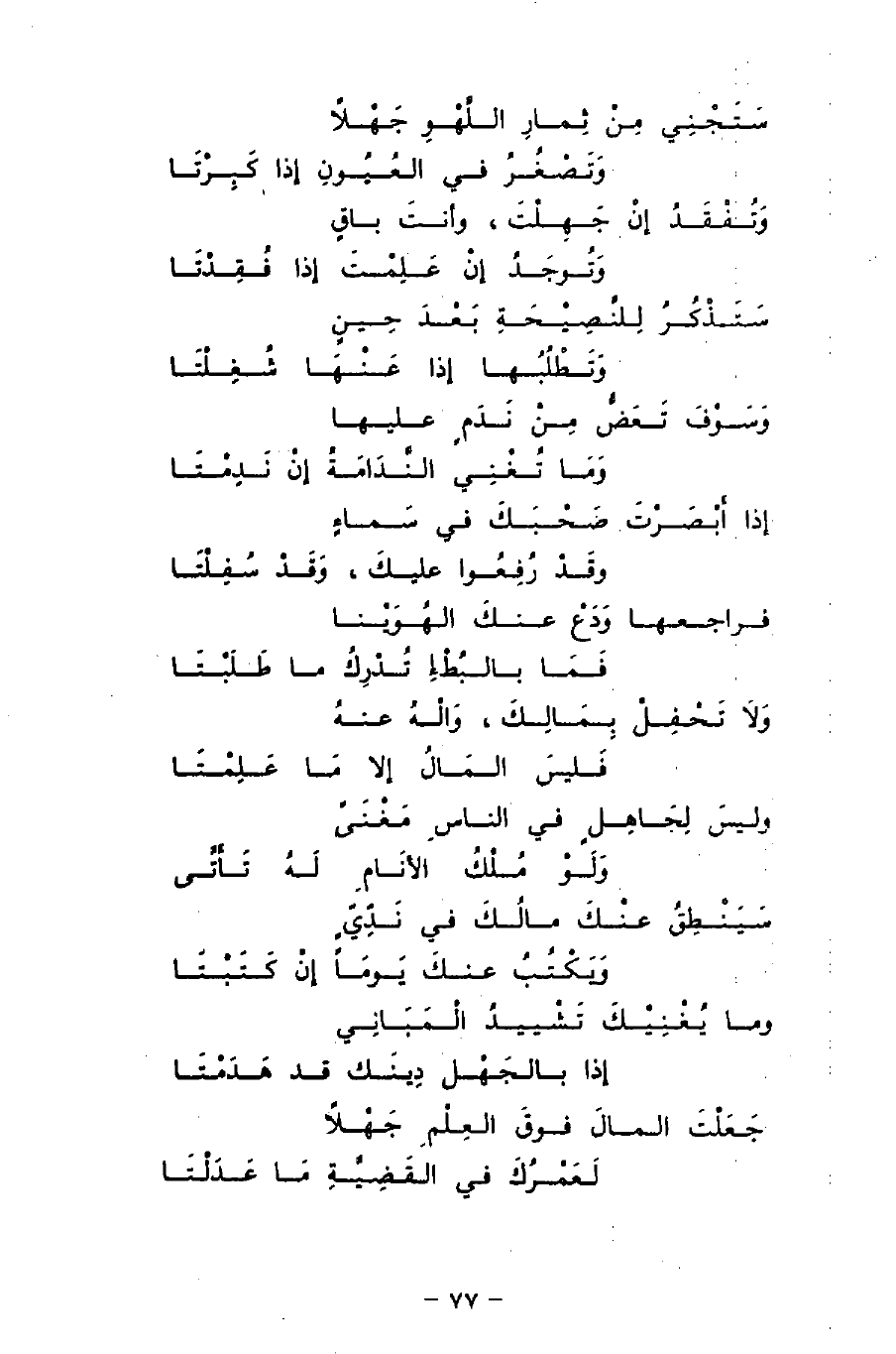 وَلاَ تَحْفِلْ بِمَالِكَ، وَالْهُ عنهُ ... فَليسَ المَالُ إلا مَا عَلِمْتَا