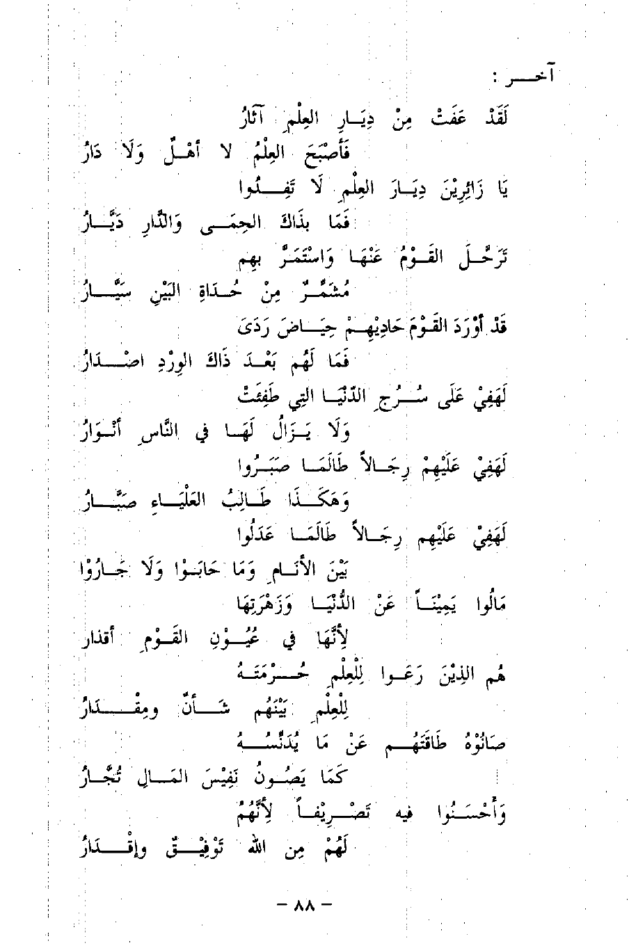 لَقَدْ عَفَتْ مِنْ دِيَارِ العِلْمِ آثَارٌ ... فَأَصْبَحَ العِلْمُ لا أَهْلٌ وَلا دَارُ
