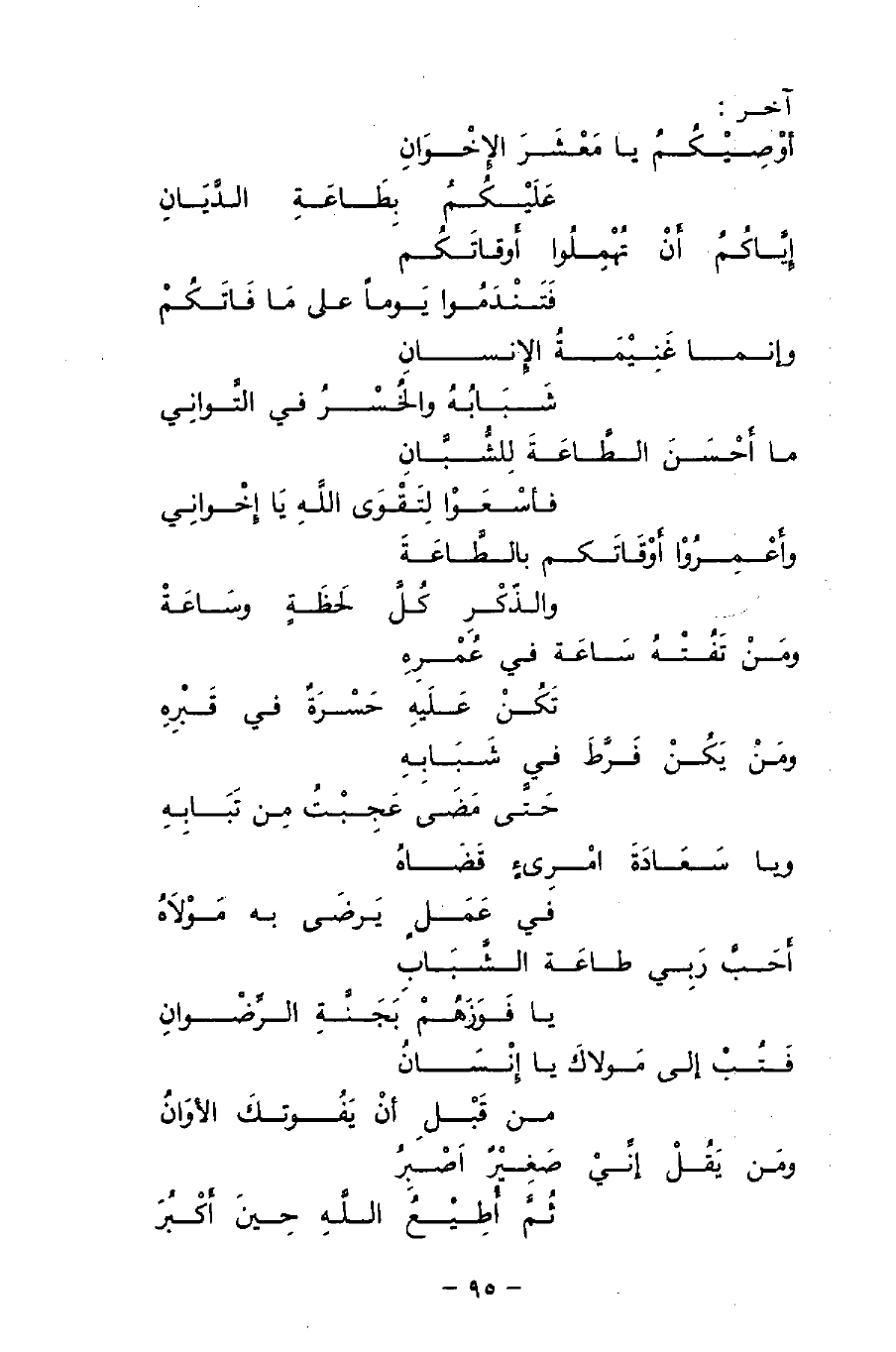 مَا أَحْسَنَ الطَّاعَةَ لِلشُّبَّانِ ... فَاسْعَوا لِتَقْوَى اللهِ يَا إِخْوانِي