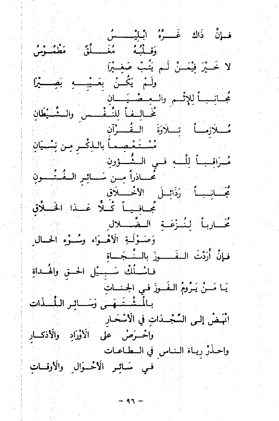 مُجانِبًا لِلإثْمِ والعِصْيَانِ ... مُخَالفًا لِلنَّفْسِ والشَّيْطَانِ