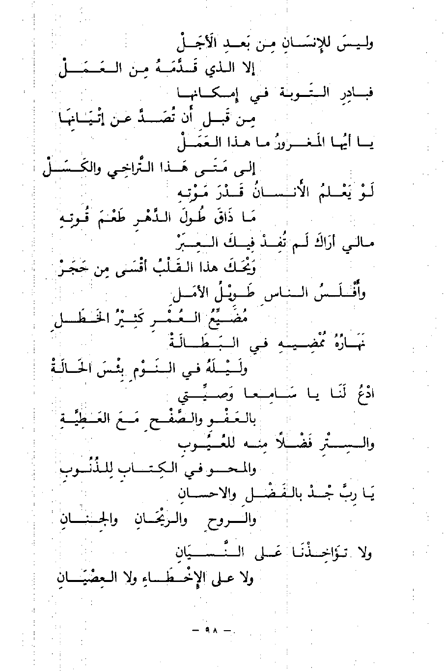 يَا أَيُّها المَغْرُورُ مَا هَذَا العَمَلْ ... إِلى مَتَى هَذَا التَّرَاخِي وَالكَسَلْ