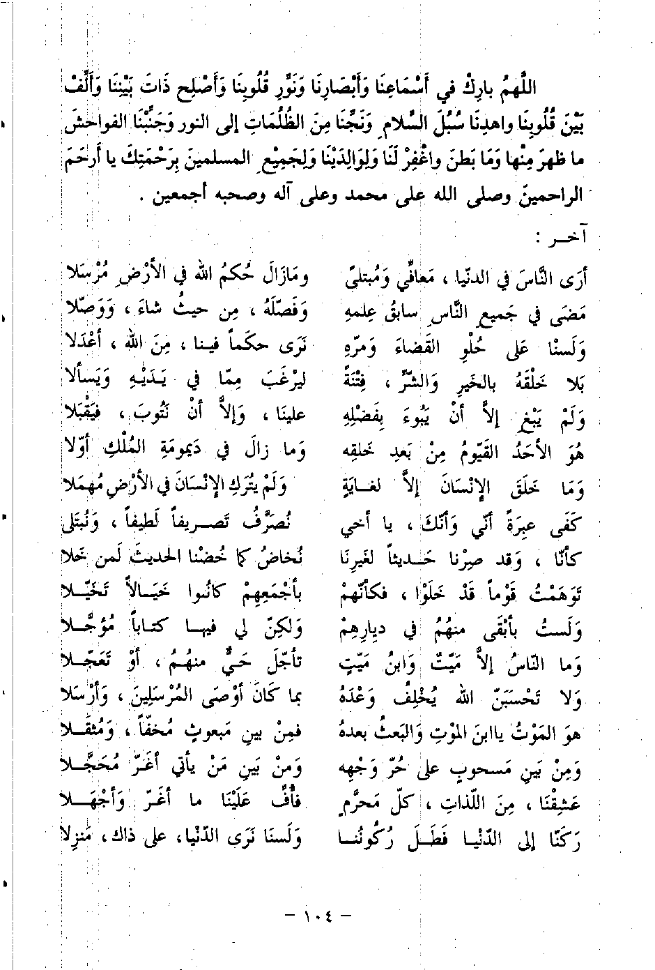 اللَّهمُ بارِكْ في أَسْمَاعِنَا وَأَبْصَارِنَا وَنَوِّرِ قُلُوبِنَا وَأَصْلِح ذَاتَ بَيْنِنَا وَأَلِّفْ بَيْنَ قُلُوبِنَا واهدِنَا سُبُل السَّلامِ وَنَجِّنَا مِنَ الظُلُمَاتِ إلى النور وَجَنِّبْنَا الفواحشَ ما ظهرَ مِنْها وَمَا بَطنَ واغْفِرْ لَنَا وَلِوَالِدَيْنَا وَلِجَمِيْعِ المسلمينَ بِرَحْمَتِكَ يا أَرحَمَ الراحمينَ وصلى الله على محمد وعلى آله وصحبه أجمعين.