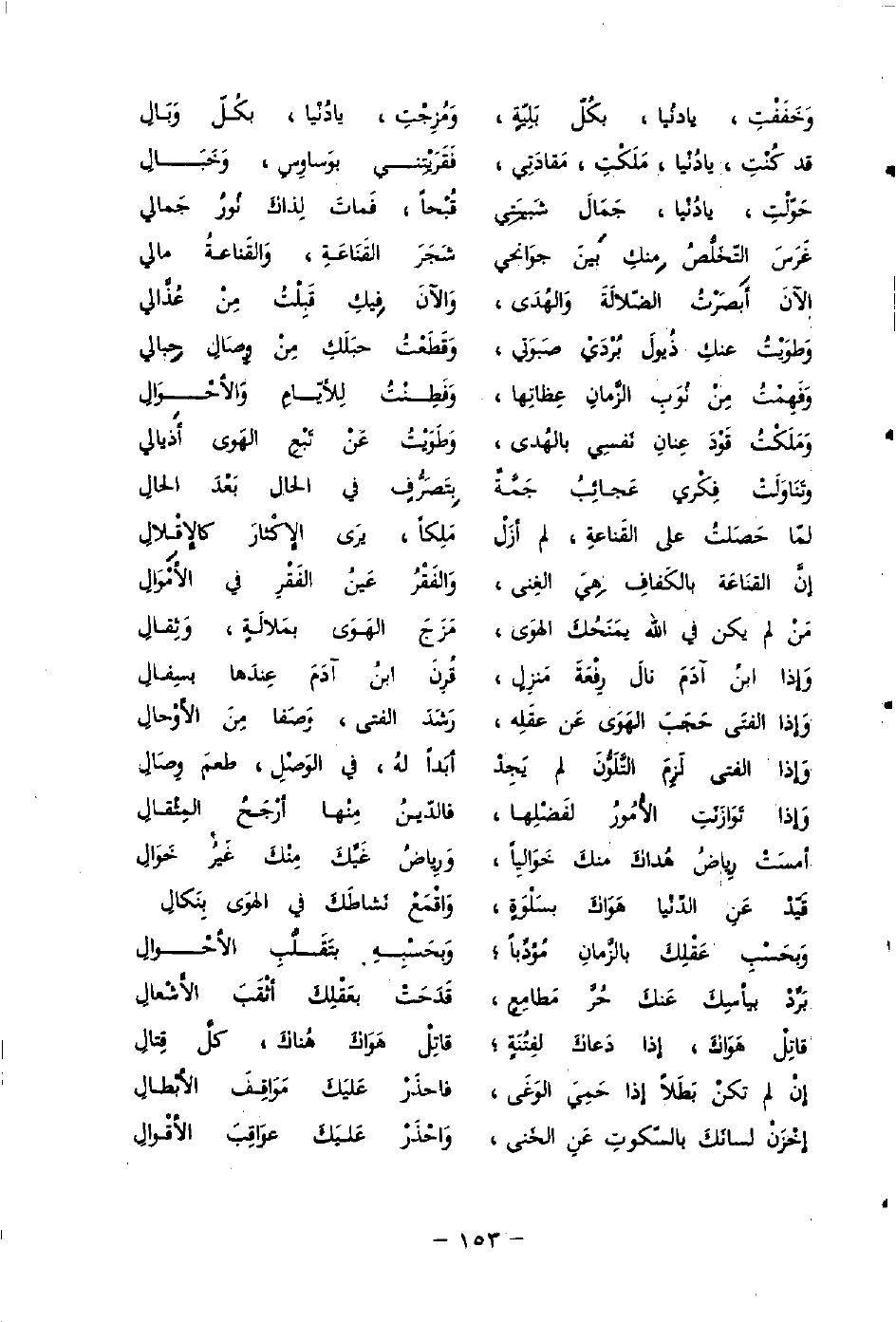 قَدْ كُنْتِ يَا دُنْيا مَلَكْتِ مَقادَتِي، ... فَقَرَيتِني بوَساوِسٍ وَخَبَالِ