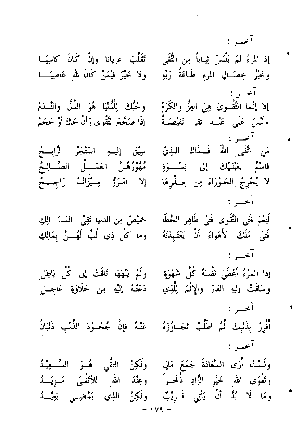 ألا إنَّما التَّقْوىَ هِيَ العِزُّ والكَرَمْ ... وحُبُّكَ لِلْدُّنْيَا هُوَ الذُلُّ والنَّدَمْ
