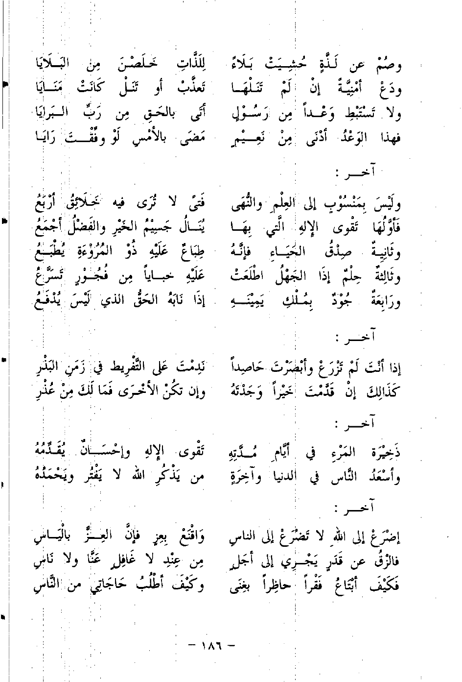 ولَيسَ بِمَنْسُوبٍ إلى العِلْمِ والنُّهَى ... فَتىً لا تُرَى فيه خَلاَئِقُ أرْبَعُ
