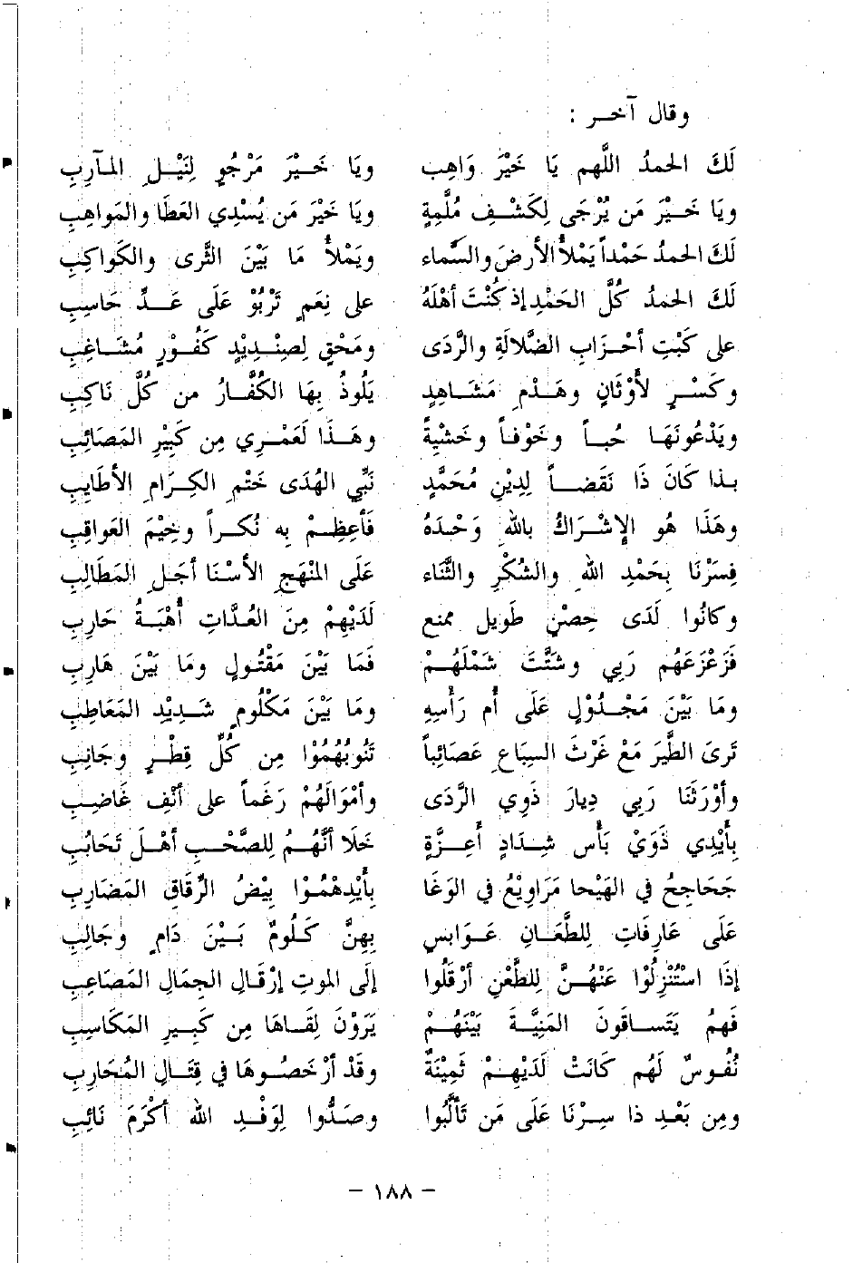 لَكَ الحمدُ حَمْدًا يَمْلأُ الأرضَ والسَّماء ... ويَمْلأُ مَا بَينَ الثَّرى والكَواكِبِ