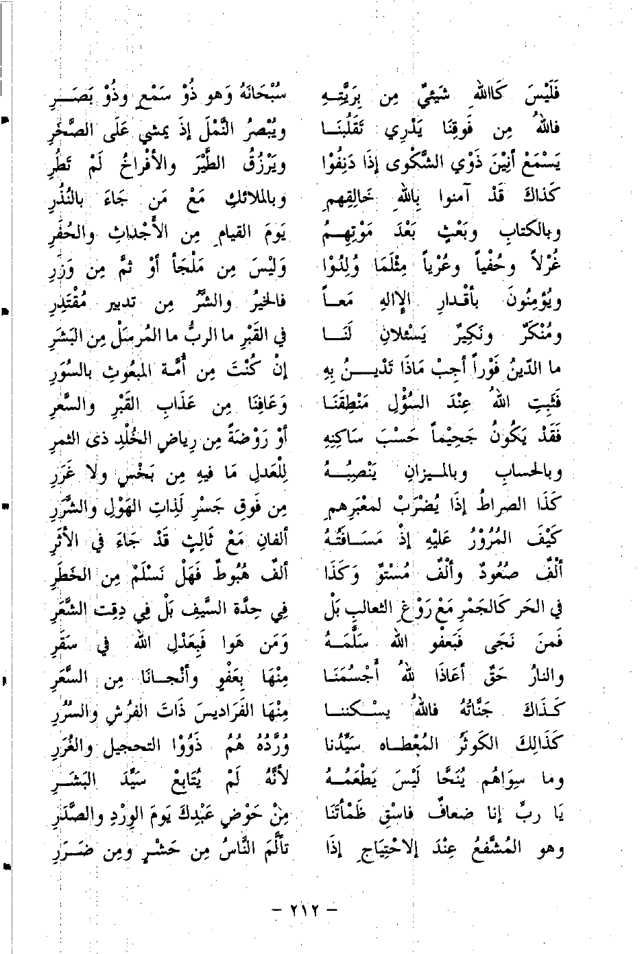 فَلَيسَ كَاللهِ شَيءٌ مِن بريَّتهِ ... سُبْحَانَهُ وَهو ذُو سَمْعٍ وذُو بَصَرِ