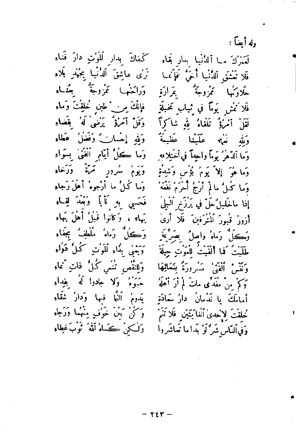 لَعَمْرُكَ ما الدُّنْيا بِدارِ بَقاءِ ... كَفاكَ بِدارِ المَوْتِ دارَ فَناءِ