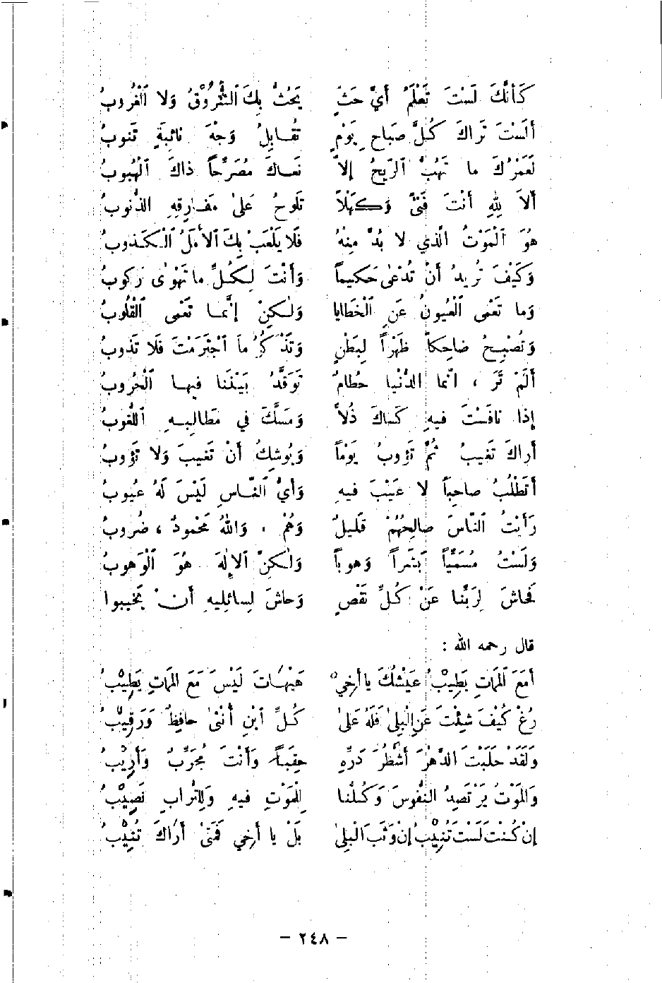 أَمَعَ المَماتِ يَطِيْبُ عَيْشُكَ يا أَخِيْ ... هَيْهَاتَ لَيْسَ مَعَ المَماتِ يَطِيْبُ