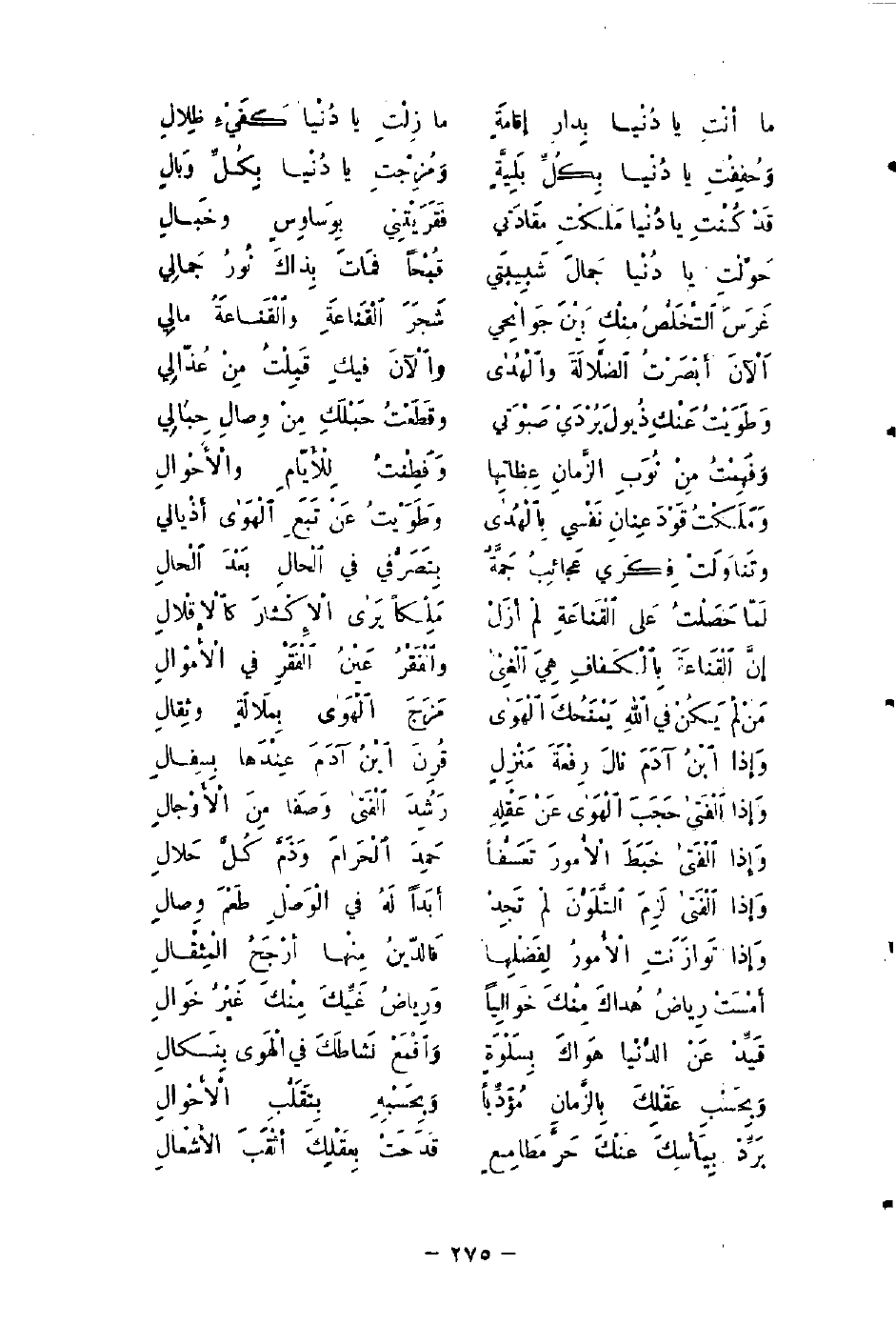 ما أَنْت يَا دُنْيا بِدَارِ إِقَامَةٍ ... مَا زِلْتِ يَا دُنْيا كَفَيءِ ظِلالِ