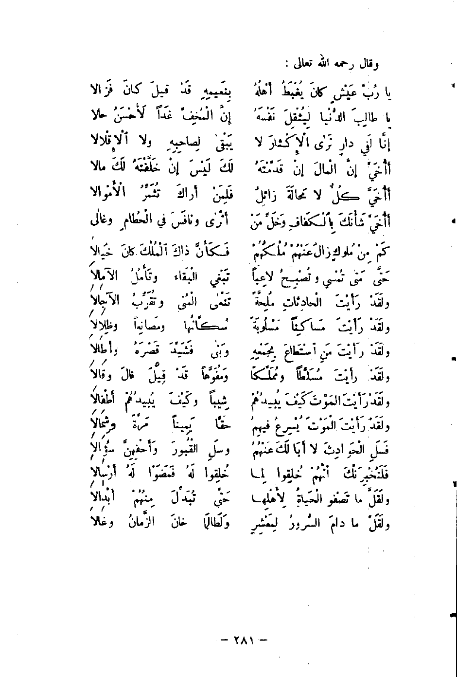 ولَقَدْ رَأَيْتَ مَساكِنًا مَسْلُوبَةً ... سُكَّانُها ومَصانِعَا وظِلالاَ