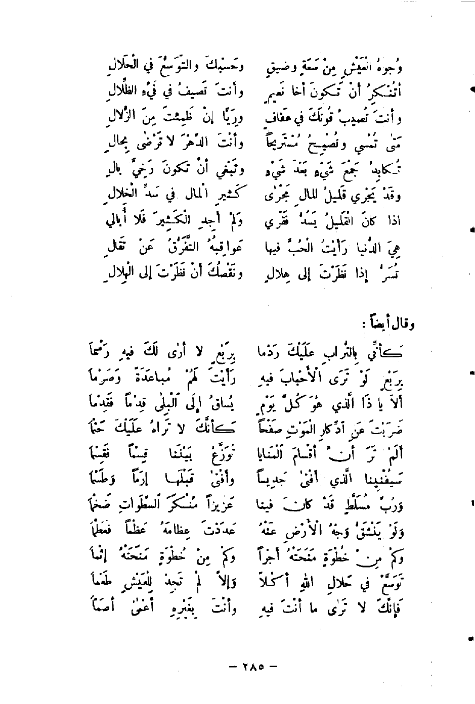 وُجوهُ الْعَيْشِ مِنْ سَعَةٍ وضيقٍ ... وحَسْبكَ والتّوَسُّعَ في الْحَلالِ