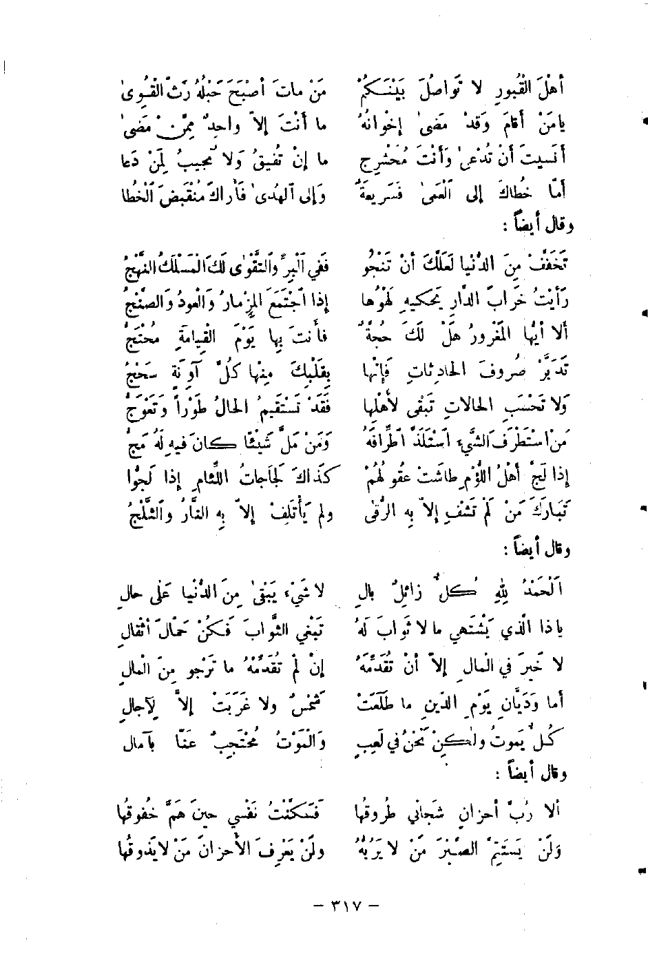 أهْلَ الْقُبورِ لا تَواصُلَ بَيْنَكُمْ ... مَنْ ماتَ أصْبَحَ حَبْلُهُ رَثَّ الْقُوَى