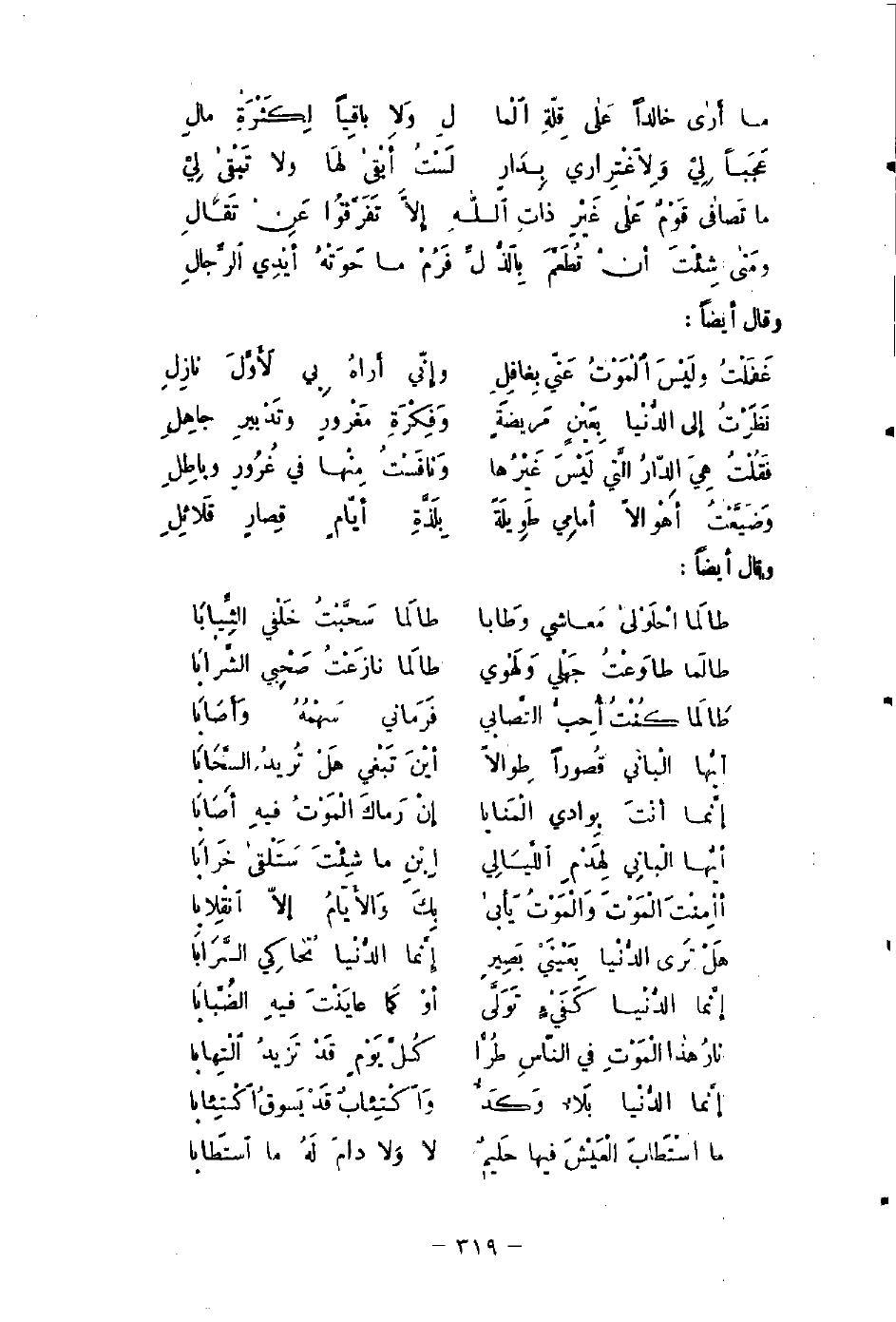 ما أَرى خالدًا على قِلَةِ الْما ... لِ وَلاِ باقِيًا لِكَثْرَةِ مالِ
