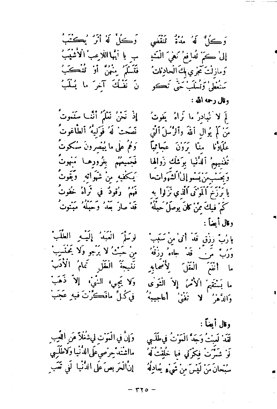 سُبْحانَ مَنْ لَيْسَ مِنْ شِيْءٍ يُعادِلُهُ ... إنَّ الْحَريصَ على الدُّنْيا لَفي تَعَب