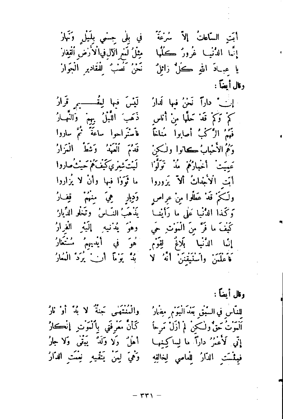 يا عِبادَ اللهِ كُلٌّ زائِلٌ ... نَحْنُ نُصْبٌ لِلْمَقاديرِ الْجَوارْ