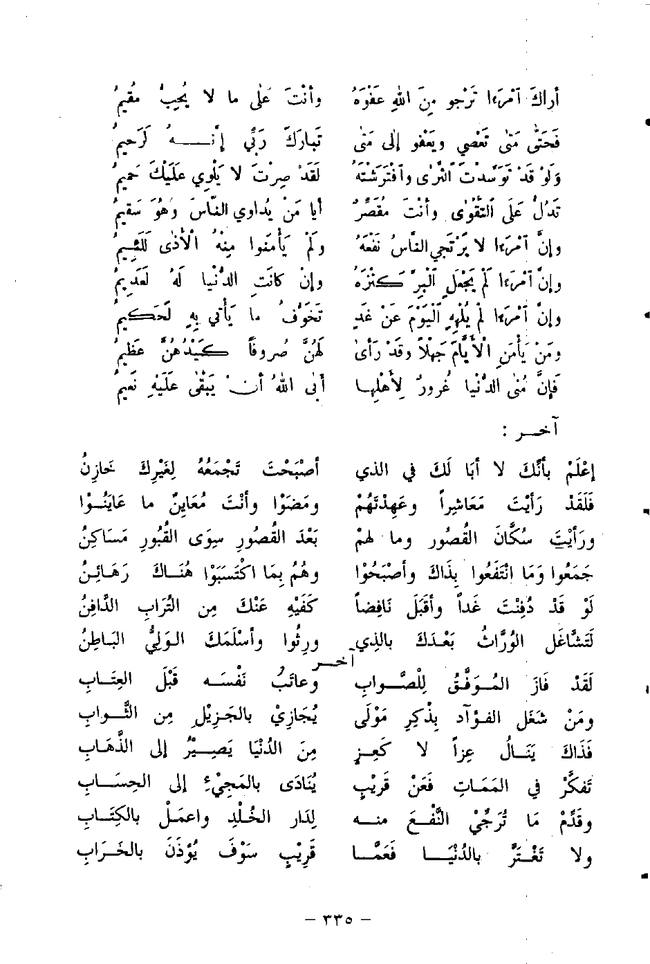 أراكَ أمْرَءًا تَرْجو مِنَ اللهِ عَفْوَهُ ... وأنْتَ عَلى ما لا يُحِبُّ مُقيمُ