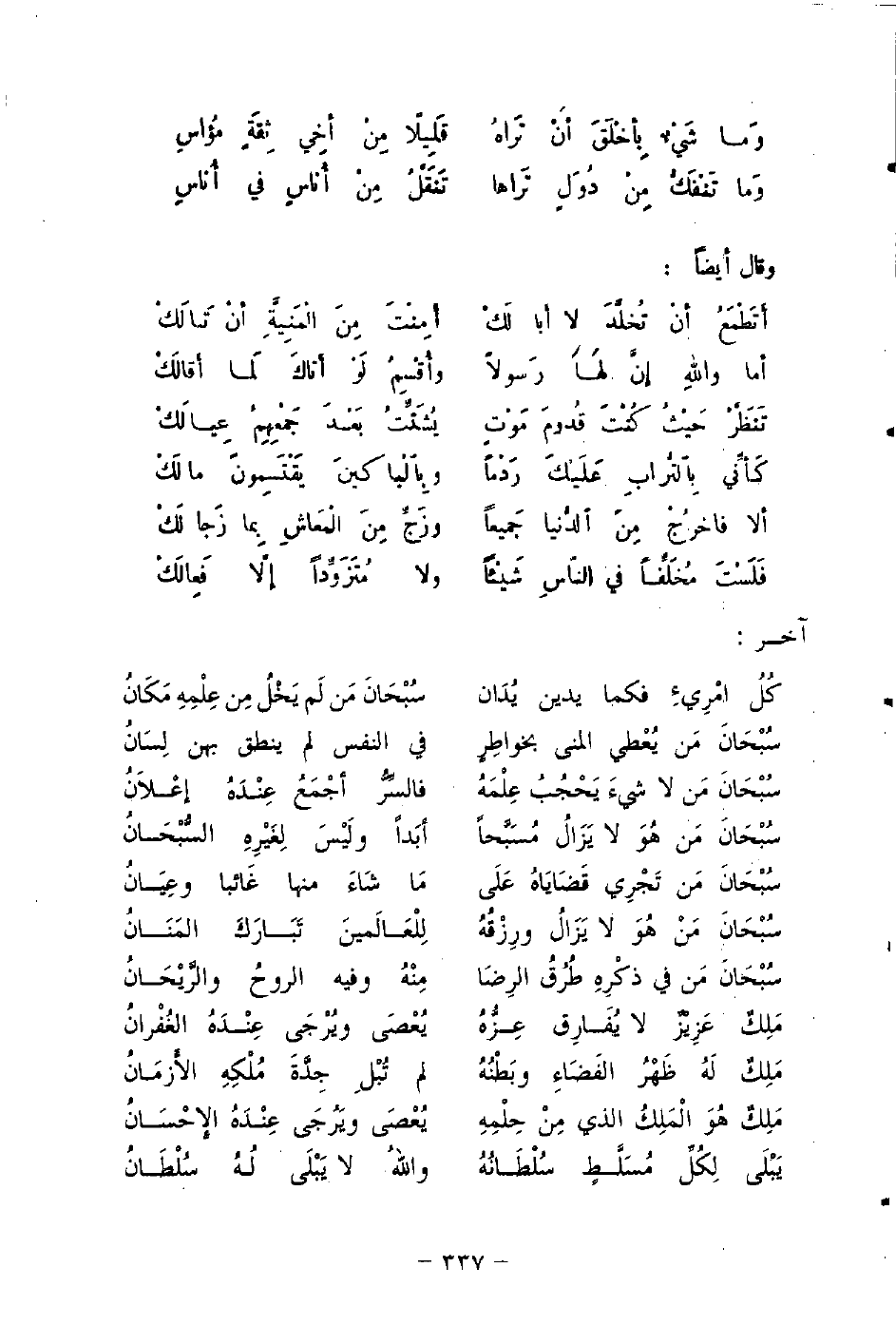سُبْحَانَ مَن هُوَ لا يَزَالُ مُسَبَّحًا ... أبَدًا ولَيْسَ لِغَيْرِهِ السُّبْحَانُ