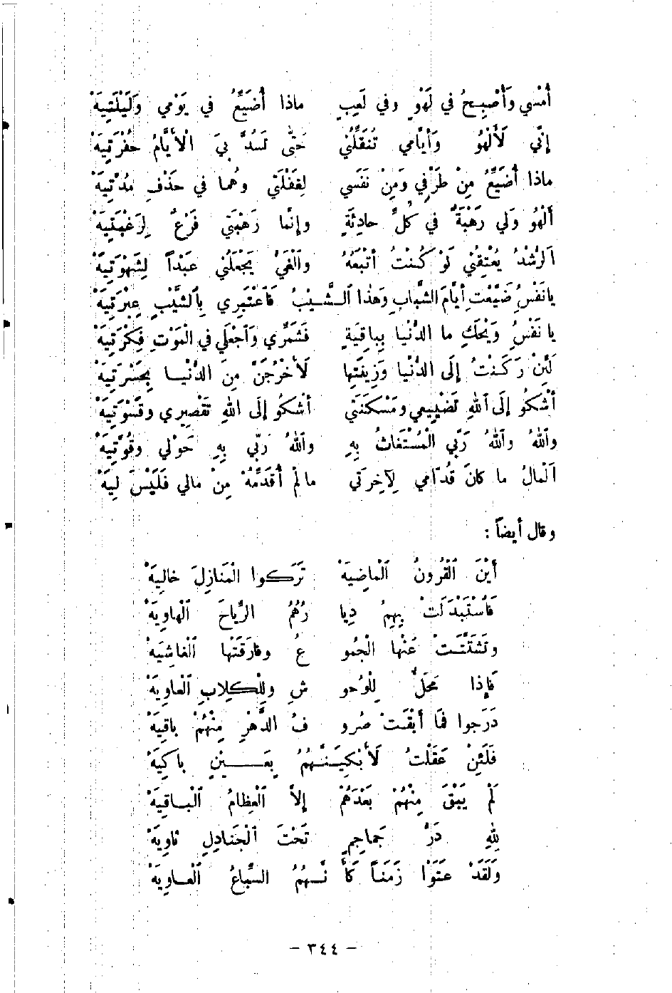 أشْكُو إلى اللهِ تَضْيِيعي ومَسْكَنَتي ... أشْكُوا إلى اللهِ تَقْصيِري وقَسْوَتِيَهْ