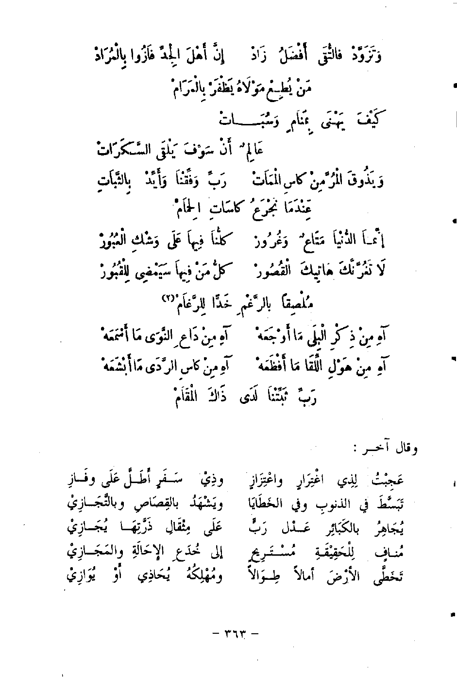 وَتَزَوَّدْ فالتُّقَى أَفْضَلُ زَادْ ... إِنَّ أَهْلَ الْجِدِّ فَازُوا بِالْمُرَادْ