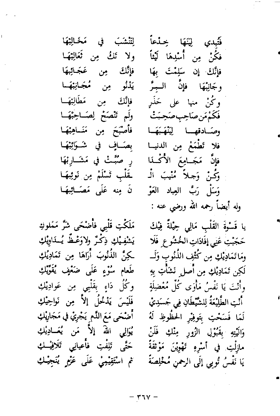 وأَنْتَ يا نَفسُ مَأْوَى كُلِّ مُعْضِلةٍ ... وَكُلُ دَاءٍ بِقلبِي مِن عَوادِيكِ