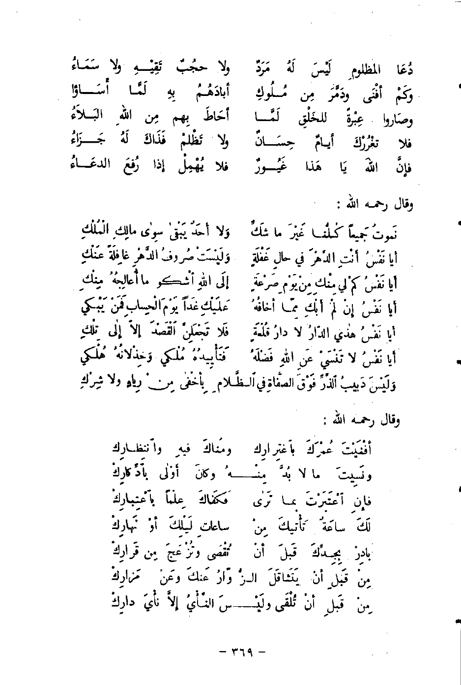 أَيا نَفْسُ إِنْ لمْ أبْكِ مِمَّا أخافُهُ ... عَلَيكِ غَداً يَومَ الْحِسابِ فَمَنْ يَبكي