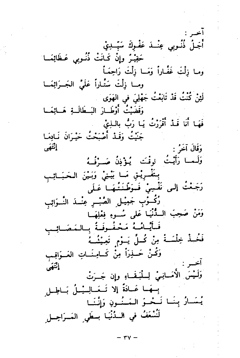 أَجَلُّ ذُنُوبِي عِنْدَ عَفْوِكَ سَيِّدِي ... حَقِيرٌ وإِنْ كَانَتْ ذُنُوبِي عَظَائِمَا