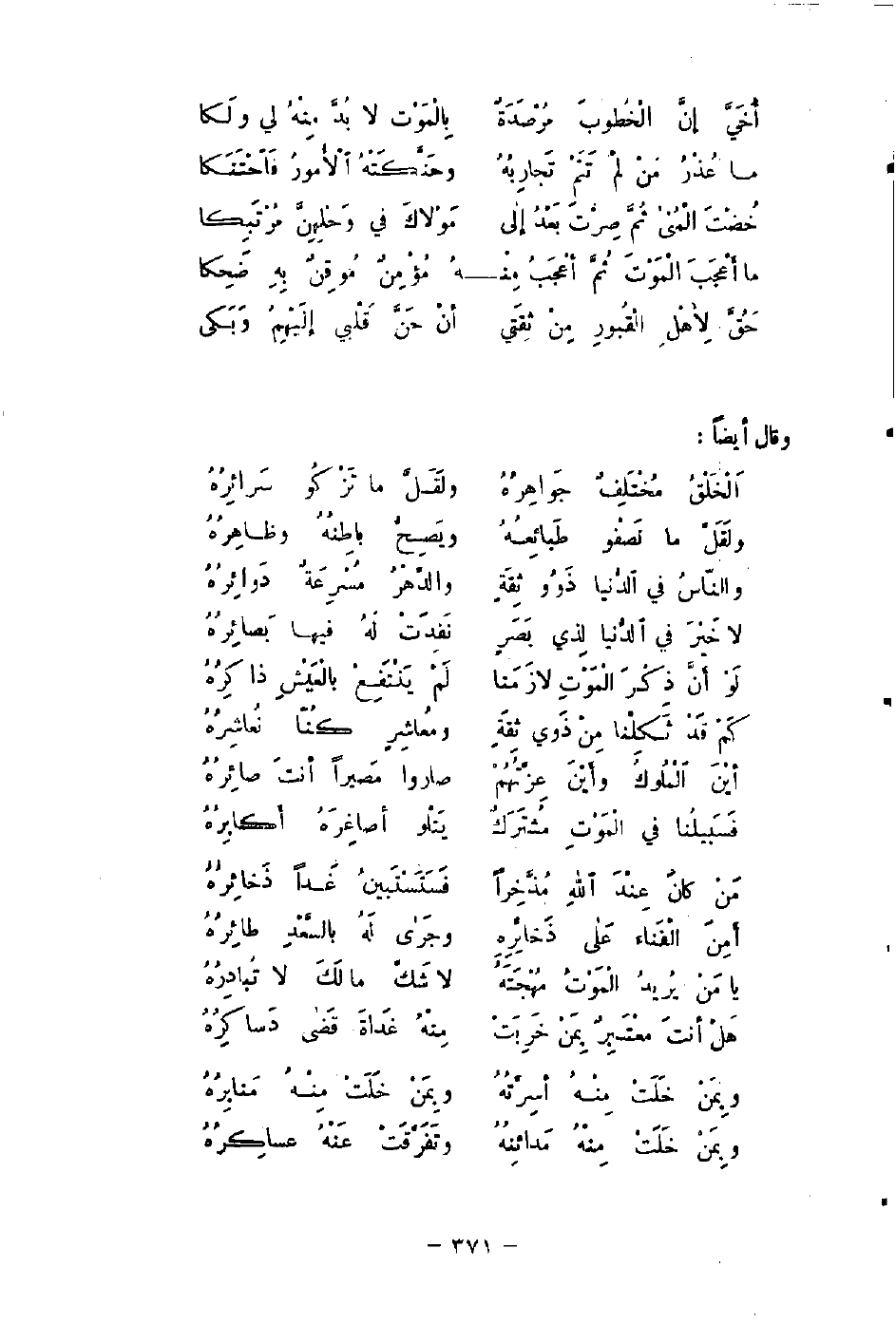 ما أَعْجَبَ الْمَوتِ ثُمَّ أعْجَبُ مِنْـ ... ـهُ مُؤْمِنٌ مُوقِنٌ بهِ ضَحِكا