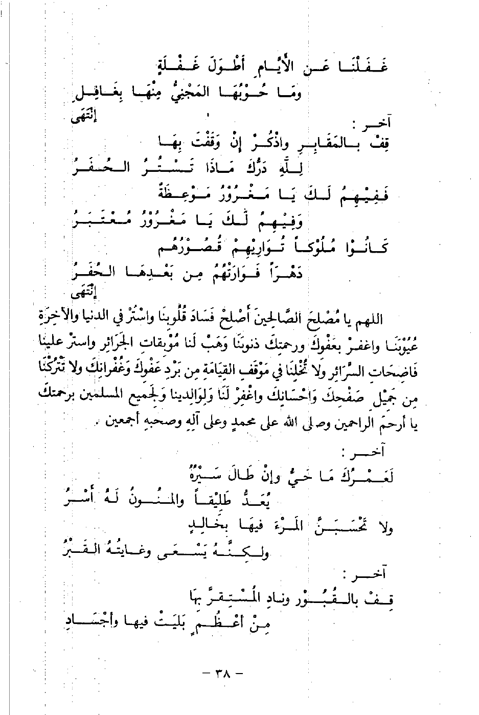 اللهم يا مُصْلحَ الصَّالحِينَ أَصْلحْ فَسَادَ قُلُوبِنَا واسْتُرْ في الدنيا والآخِرَةِ عُيُوبَنَا واغفرْ بعَفْوِكَ ورحمتِكَ ذَنوبَنَا وَهَبْ لَنا مُوبِقاتِ الجَرَائِر واسترْ عَلينا فَاضِحَاتِ السَّرَائِر ولا تُحْلِنَا في مَوقَفِ القِيَامَةِ مِن بَرْدِ عَفْوِكَ وَغُفْرانِكَ ولا تَتُرُكْنَا مِن جَمِيلِ صَفْحِكَ وَاحْسَانِكَ واغْفِرْ لَنَا وَلِوَالِدينَا وَلَجِميع المسلمين برحمتكَ يا أرحمَ الراحمين، وصلِّ الله عَلَى محمدٍ وعَلَى آلِهِ وصحبه أجمعين.