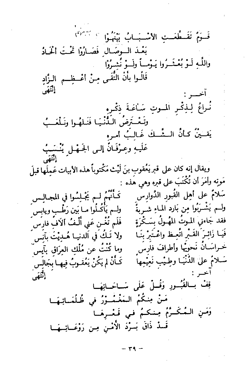 ويقال إنه كان عَلَى قبر يَعُقوب بنَ لَيث مَكْتوبًا هذه الأبيات عَمِلَها قبلَ مَوتِه وأمَرَ أن تُكْتَبَ عَلَى قبره وهي هذه: