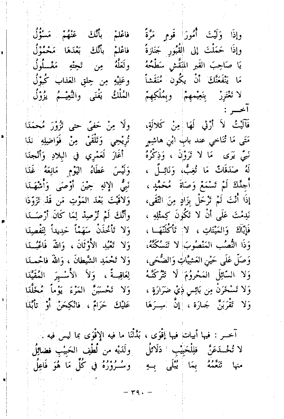 وَذَا النُّصُب المَنْصُوبَ لا تَنَسُكّنَّهُ، ... وَلا تَعْبُدِ الأَوثَانَ، وَاللهَ فَاعْبُدَا
