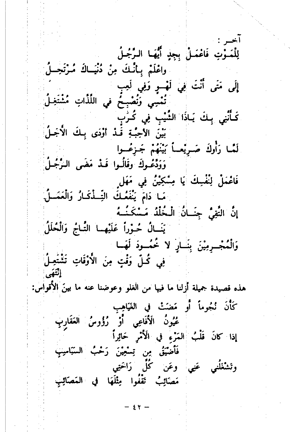 لِلْمَوتِ فَاعْمَلْ بِجِدٍ أَيُّهَا الرَّجُلُ ... واعْلَمْ بِأَنَّكَ مِنْ دُنْيَاكَ مُرْتَحِلُ