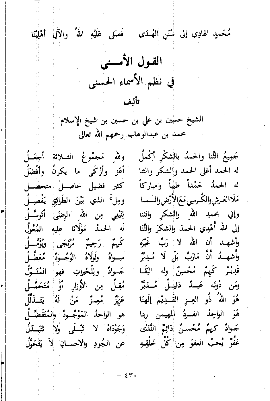 جَميعُ الثَّنا والحمدُ بالشكْرِ أكْملُ ... وللهِ مَجمُوعُ الثلاثة أجعَلُ