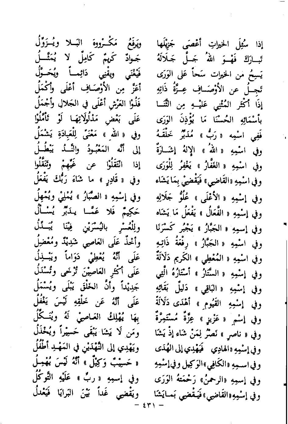 وفي اسْمِهِ «الفَّعَالُ» يَفْعَلُ مَا يَشَاه ... حَكِيمٌ فَلا عَمَّا يَدَبِّرُ يُسْألُ