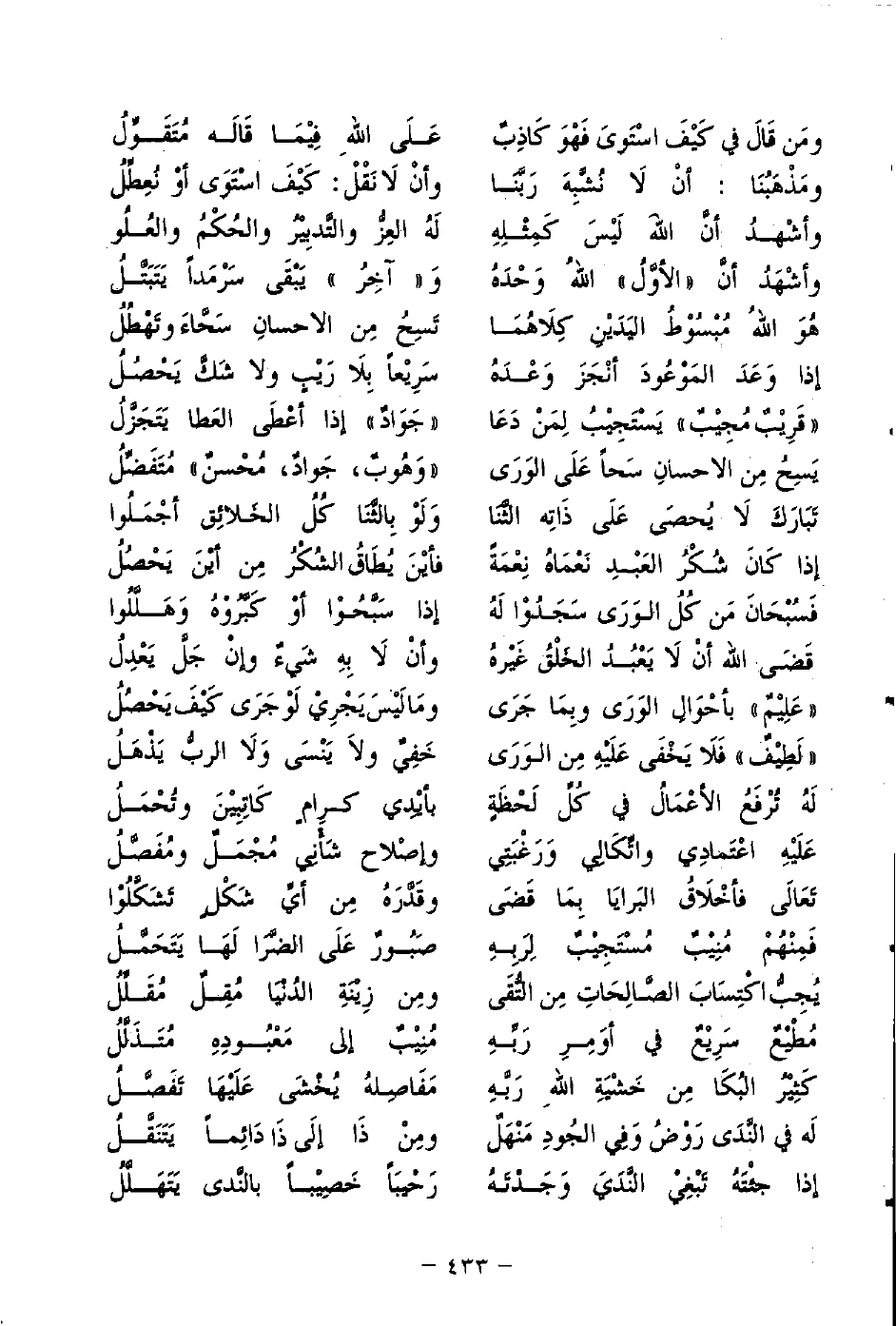 وأشْهدُ أَنَّ اللهَ لَيسَ كَمِثْلِهِ ... لَهُ العِزُّ والتَّدبِيرُ والحُكْمُ والعُلُو