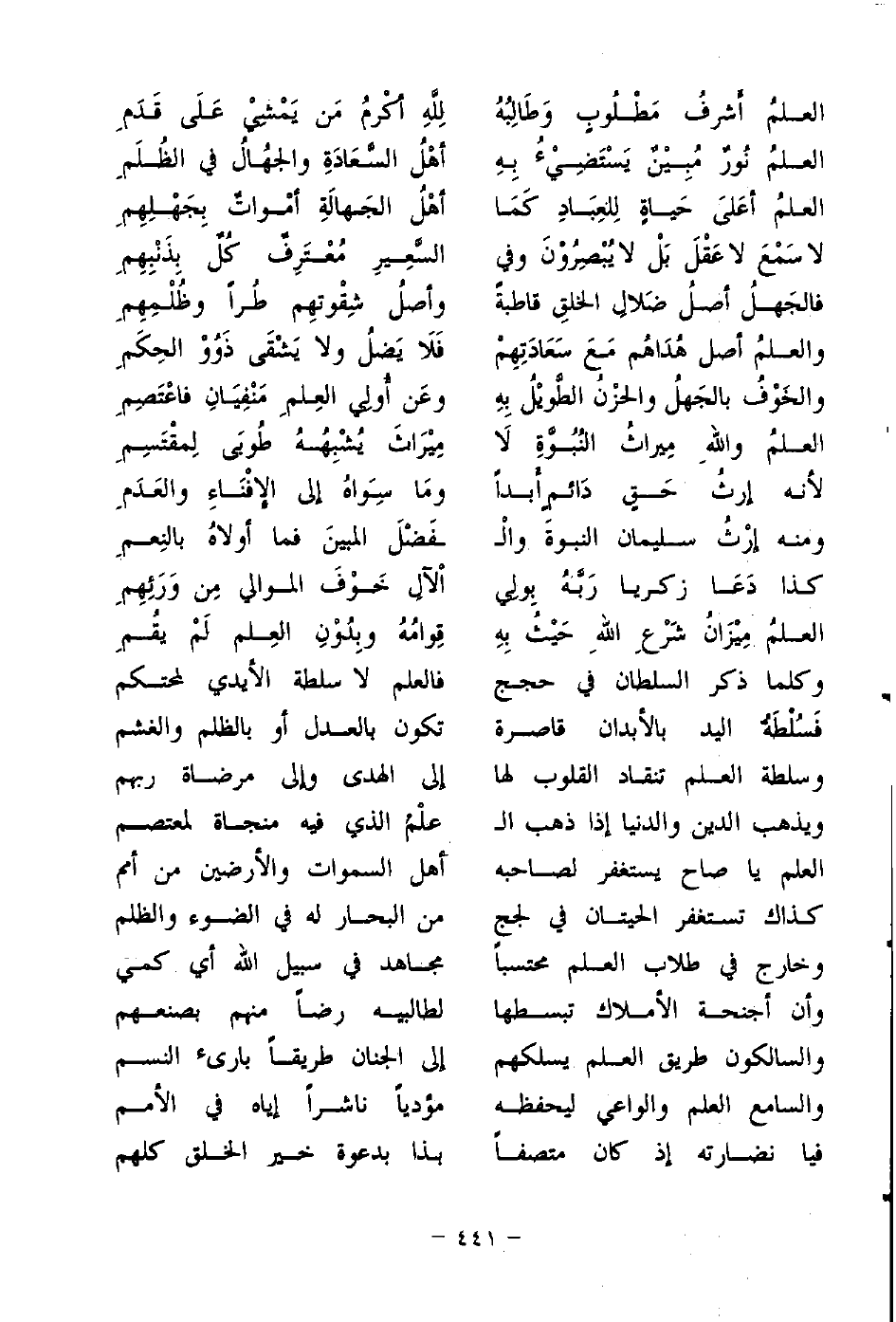 العِلمُ نُورٌ مُبَينٌ يَسْتَضِيءُ بِهِ ... أهْلُ السَّعَادَةِ والجهُالُ في الظُلَمِ