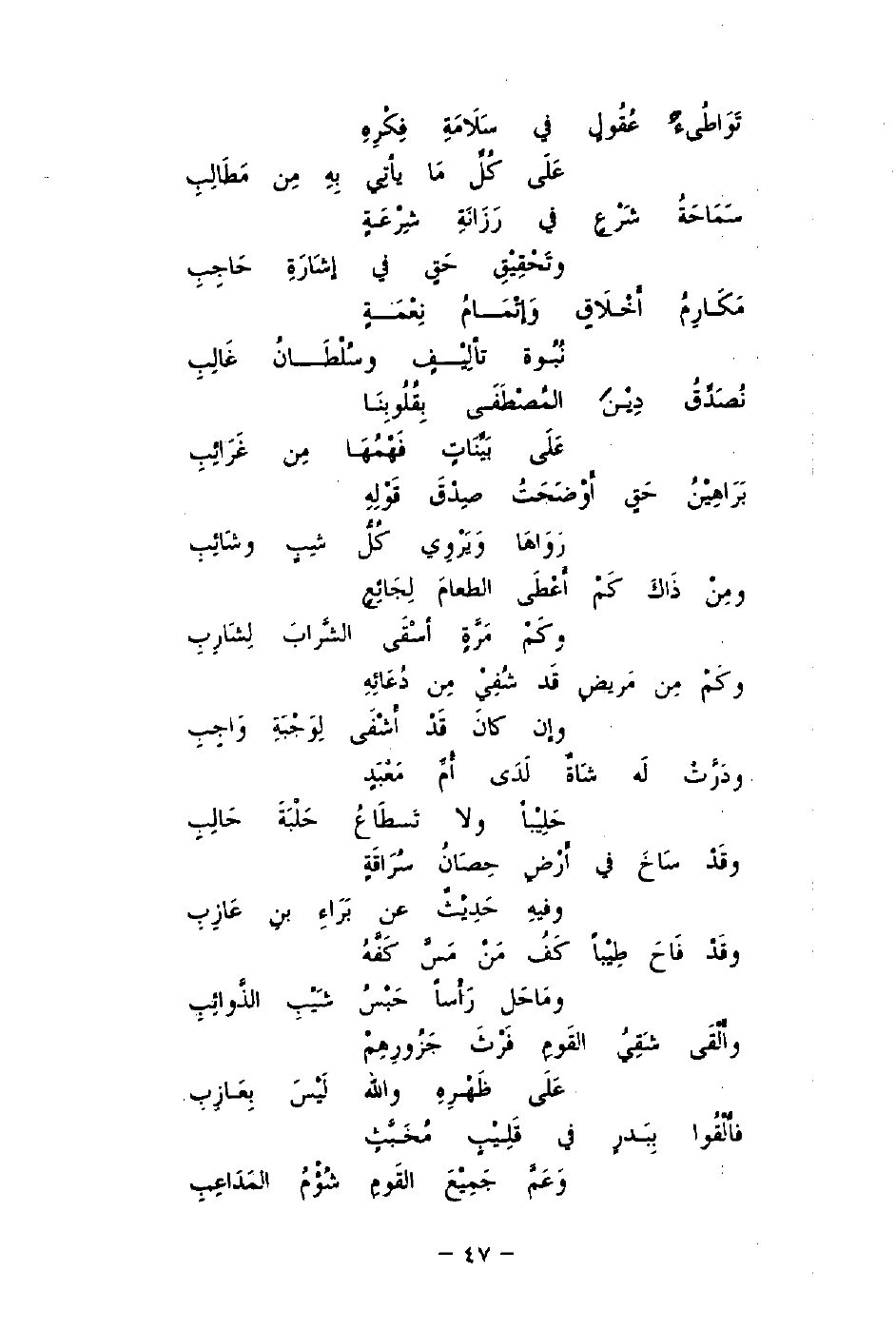 مَكَارِمُ أَخْلاَقٍ وَإِتْمَامُ نِعْمَةٍ ... نُبُوَّة تألِيفٍ وسُلْطَانُ غَالِبِ