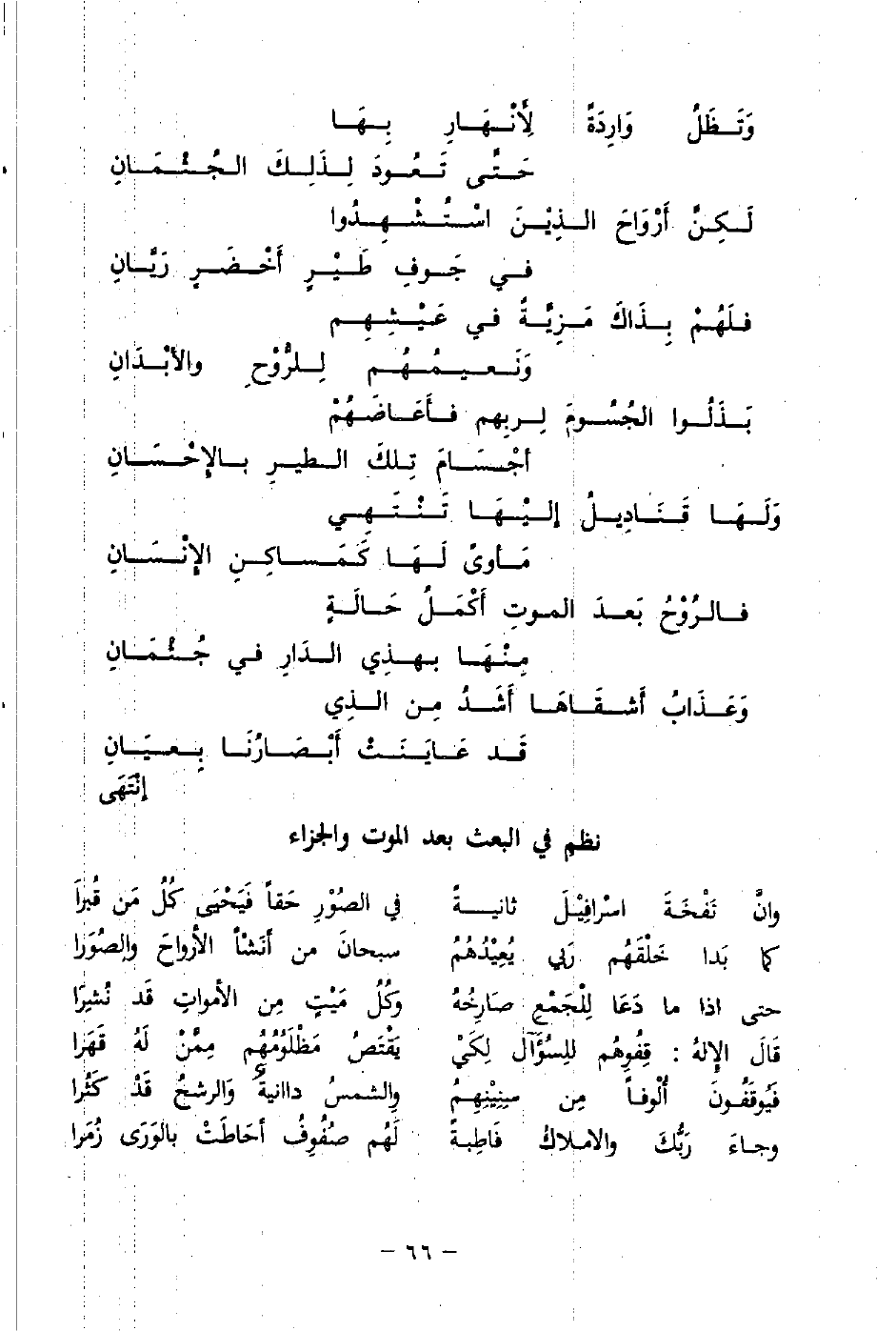 لَكِنَّ أَرْوَاحَ الذِينَ اسْتُشْهِدُوا ... في جَوفِ طَيرٍ أَخْضَر رَيَّانِ