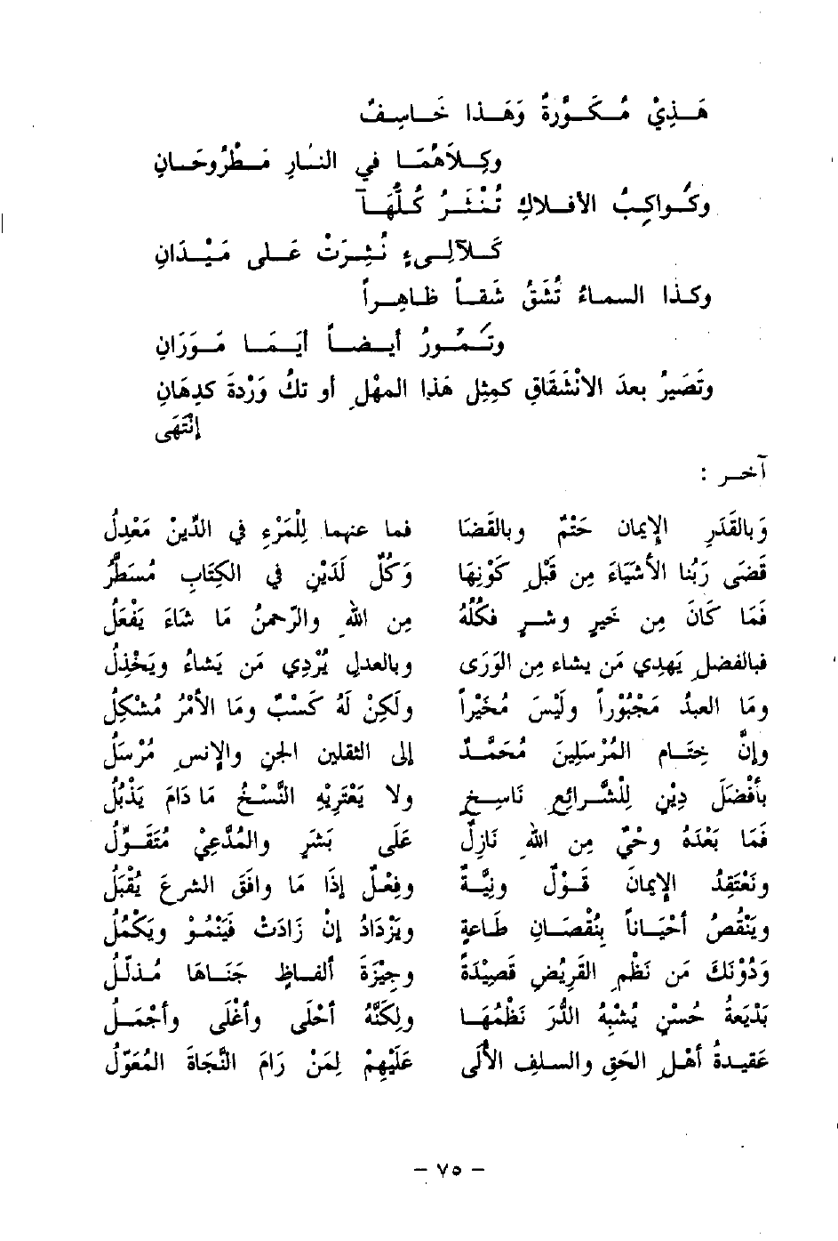 ويَنْقُصُ أحْيَانًا بِنُقْصَانِ طَاعةٍ ... ويَزْدَادُ إنْ زَادَتْ فَيَنْمُو ويَكْمُلُ ...