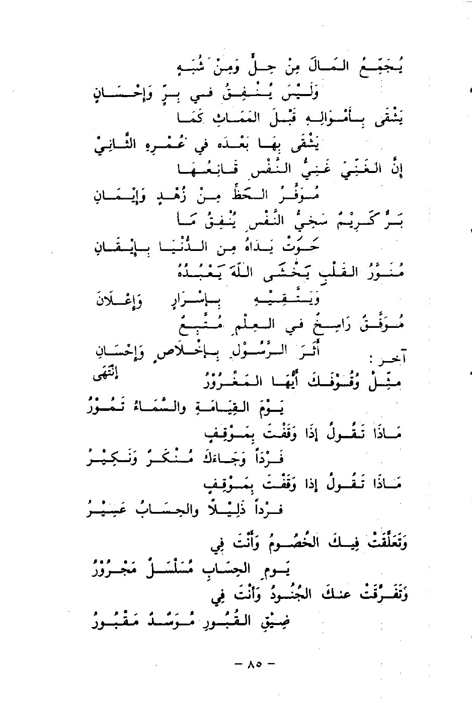 إِنَّ الغَنِّيَّ غَنِيُّ النَّفْسِ قَانِعُهَا ... مُوَفَّرُ الحَظِّ مِنْ زُهْدٍ وَإِيمَانِ