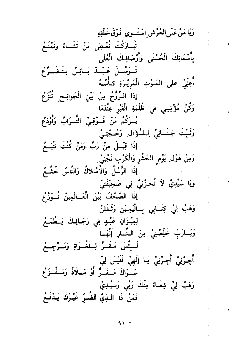 وَمِنْ هَوْلِ يَوْمٍ الحَشْرِ وَالكَرْبِ نَجَّنِي ... إِذَا الرُّسْلُ وَالأَمْلاكُ وَالنَّاسُ خُشَّعُ