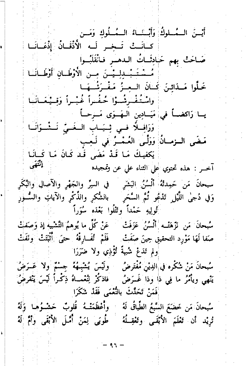 سُبحانَ مَن نَزّهَتْه ألْسُنٌ عَزَفَتْ ... عَنْ كُلِّ ما يُوهمُ التَّشْبِيه إذ وَصَفتْ